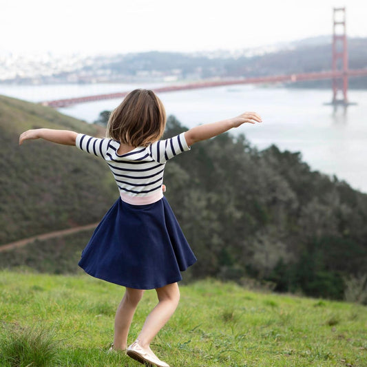 Lightweight Blocked Organic Skater Dress - Navy with Light Pink Ribbon